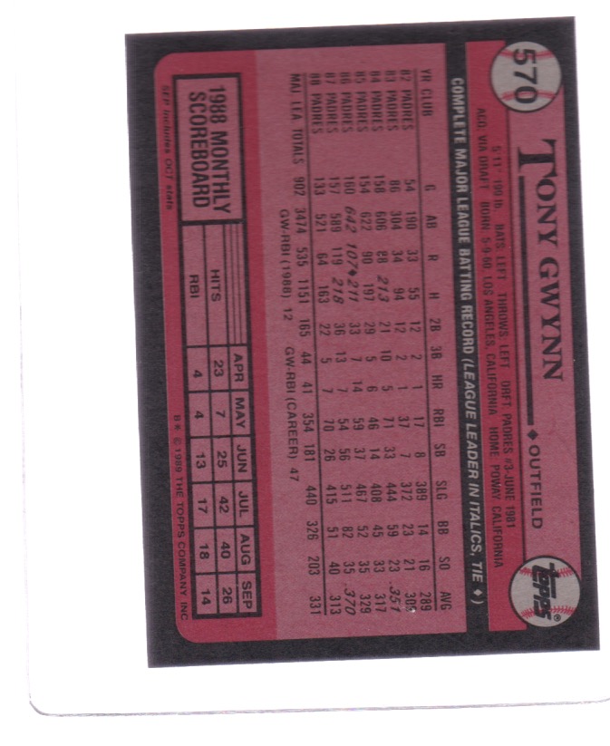 Baseball (Brand: Topps) (Type: ) (Subtype: ) (Kind of Packaging: ) (Year: 1989) (Unique Number: 570) (Player:Tony Gwynn)