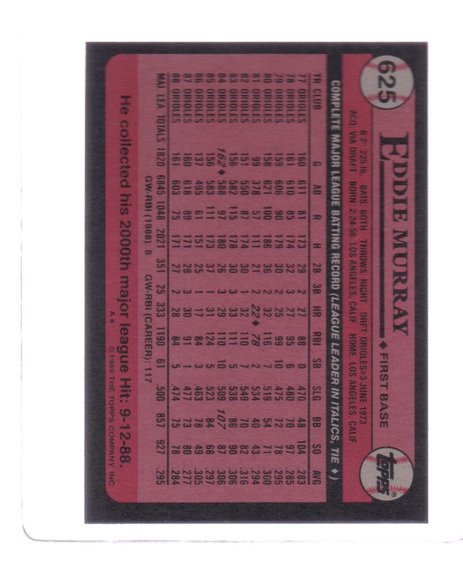 Baseball (Brand: Topps) (Type: ) (Subtype: ) (Kind of Packaging: ) (Year: 1989) (Unique Number: 625) (Player:Eddie Murray)