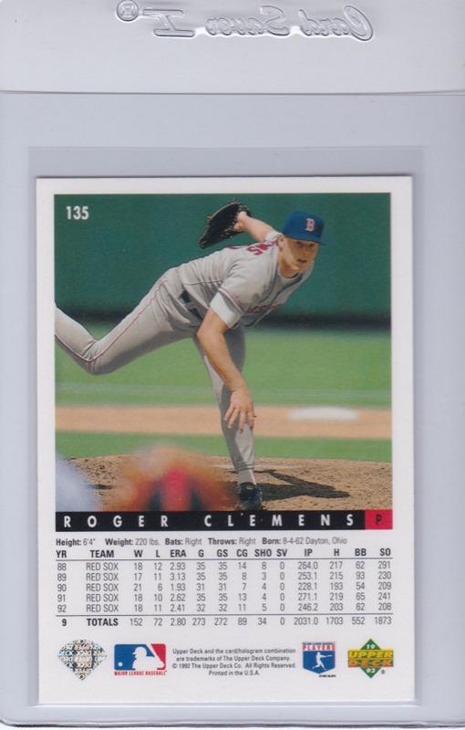 Baseball (Brand: Upper Deck) (Type: ) (Subtype: ) (Hall of Famer: N) (Superstar: Y) (Rookie: N) (Kind of Packaging: Semi-Rigid with Sleeve) (Year: 1992) (Unique Number: 135) (Numbered Card: ) (Player:Roger Clemens)