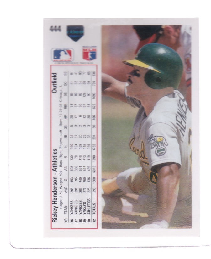 Baseball (Brand: Upper Deck) (Type: Upper Deck 1991) (Subtype: ) (Kind of Packaging: Semi-Rigid with Sleeve) (Year: 1990) (Unique Number: 444) (Player:Rickey Henderson)