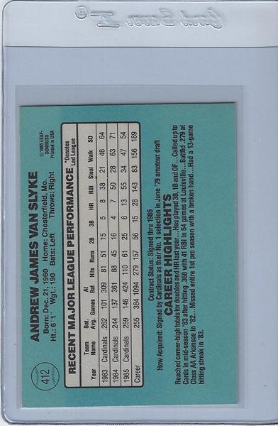 Baseball Cards (Player: Andy van Slyke)(Brand: Leaf) (Type: Donrus ’86) (Subtype: N/A) (Kind of Packaging: Semi-Rigid) (Hall of Famer: Yes) (Superstar: No) (Rookie: No) (Unique Number: 412)(Year: 1985)