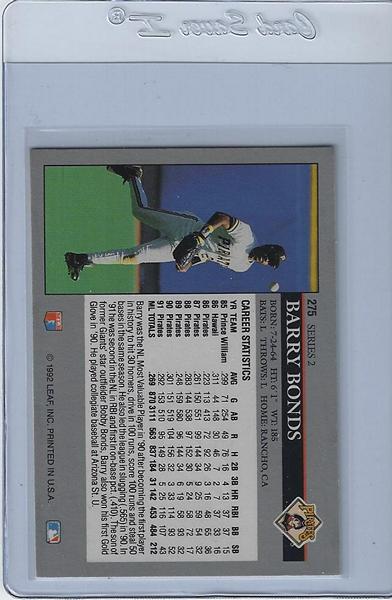 Baseball Cards (Player: Barry Bonds)(Brand: Leaf) (Type: N/A) (Subtype: N/A) (Kind of Packaging: Semi-Rigid) (Hall of Famer: No) (Superstar: Yes) (Rookie: No) (Unique Number: 275)(Year: 1992)