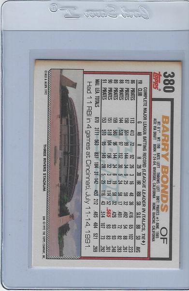 Baseball Cards (Player: Barry Bonds)(Brand: Topps) (Type: N/A) (Subtype: N/A) (Kind of Packaging: Semi-Rigid) (Hall of Famer: No) (Superstar: Yes) (Rookie: No) (Unique Number: 380)(Year: 1992)