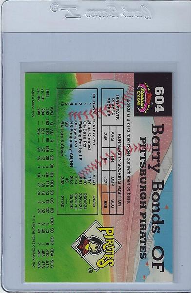 Baseball Cards (Player: Barry Bonds)(Brand: Topps) (Type: Stadium Club) (Subtype: N/A) (Kind of Packaging: Semi-Rigid) (Hall of Famer: No) (Superstar: Yes) (Rookie: No) (Unique Number: 604)(Year: 1992)