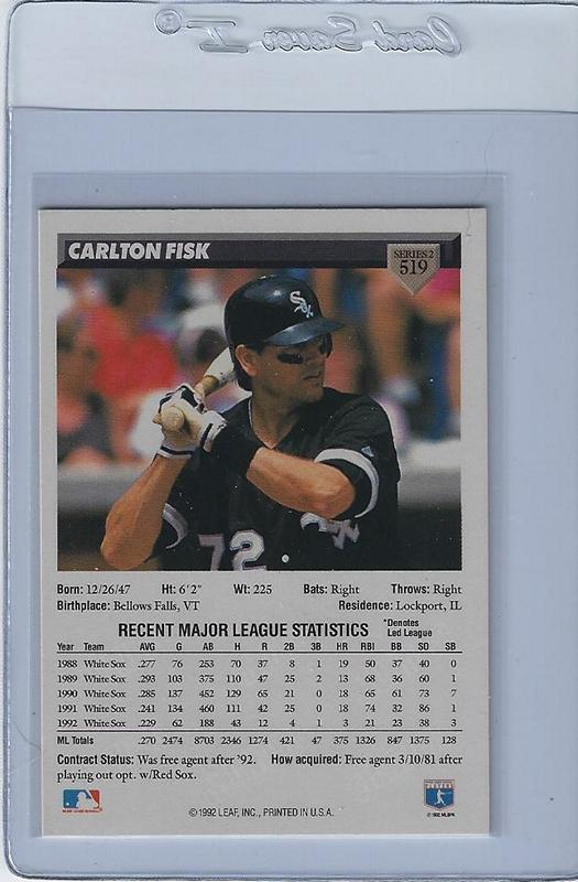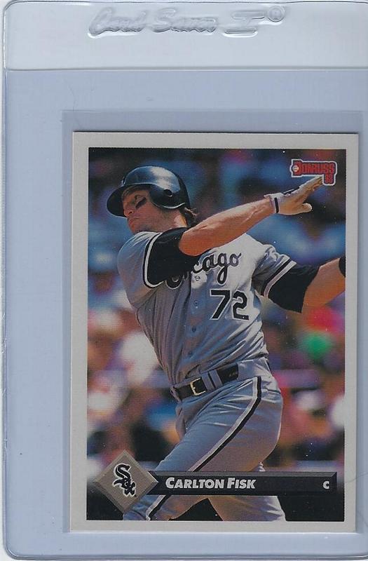 Baseball Cards (Player: Carlton Fisk) (Type: Donrus) (Unique Number: 519) (Kind of Packaging: Semi-Rigid) (Sleeve: Yes) (Hall of Fame: Yes) (Superstar: Yes) (Rookie: No) (Year: 1992)