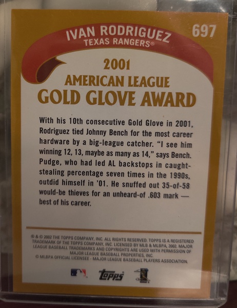 Baseball Card (Player: Ivan Rodriguez) (Superstar: No) (Hall of Fame: Yes) (Rookie: No) (Kind of Packaging: Top-Loader) (Sleeve: Yes) (Unique Number: 697) (Year: 2002)