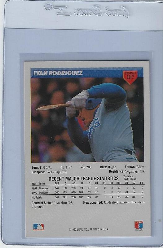 Baseball Cards (Player: Ivan Rodriguez) (Type: Donrus) (Unique Number: 187) (Kind of Packaging: Semi-Rigid) (Sleeve: Yes) (Hall of Fame: Yes) (Superstar: Yes) (Rookie: No) (Year: 1992)