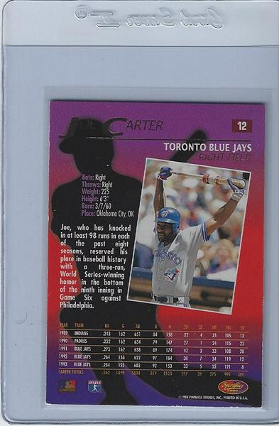 Baseball Cards (Player: Joe Carter)(Brand: Pinnacle) (Type: SportFlics) (Subtype: N/A) (Kind of Packaging: Semi-Rigid) (Hall of Famer: Yes) (Superstar: No) (Rookie: No) (Unique Number: 12)(Year: 1994)