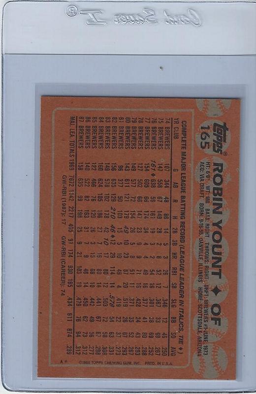 Baseball Cards (Player: Robin Yount) (Type: No/A) (Unique Number: 165) (Kind of Packaging: Semi-Rigid) (Sleeve: Yes) (Hall of Fame: Yes) (Superstar: Yes) (Rookie: No) (Year: 1988)