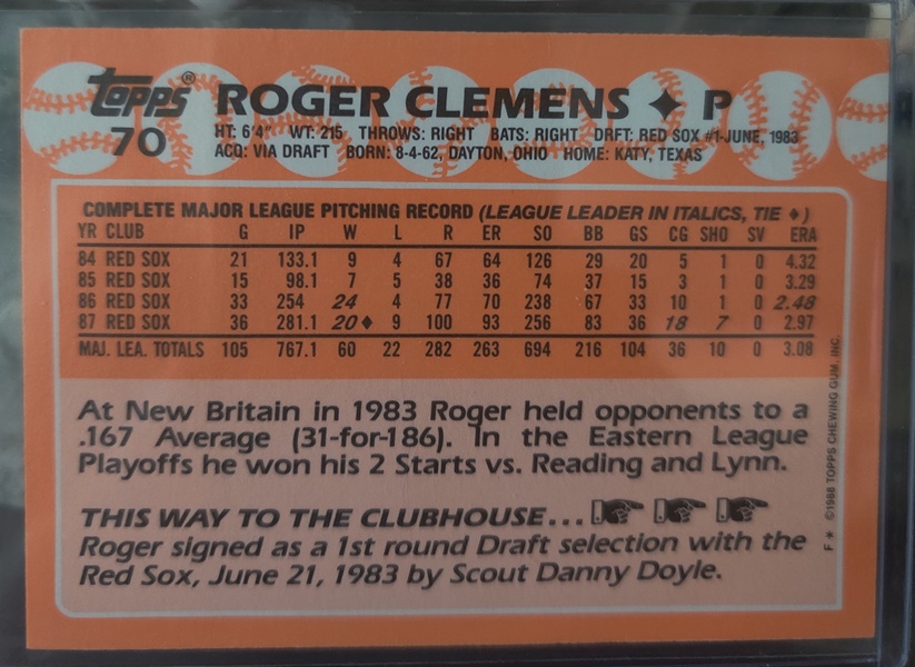 Baseball Card (Player: Roger Clemens) (Superstar: Yes) (Hall of Fame: No) (Rookie: No) (Kind of Packaging: Top-Loader) (Sleeve: Yes) (Unique Number: 70) (Year: 1988)