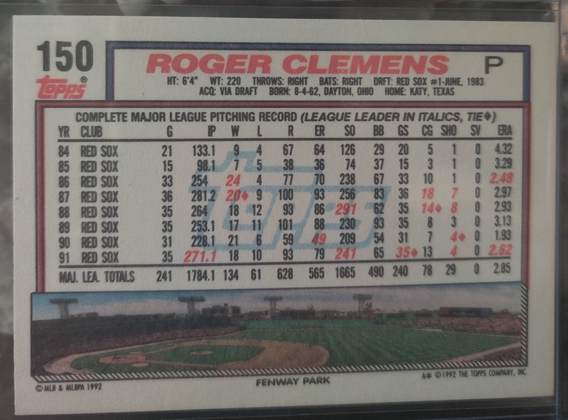 Baseball Card (Player: Roger Clemens) (Superstar: Yes) (Hall of Fame: No) (Rookie: No) (Kind of Packaging: Top-Loader) (Sleeve: Yes) (Unique Number: 150) (Year: 1992)