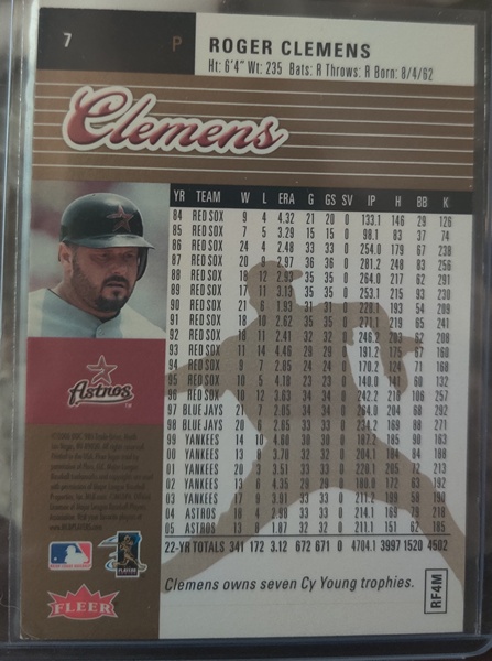 Baseball Card (Player: Roger Clemens) (Superstar: Yes) (Hall of Fame: No) (Rookie: No) (Kind of Packaging: Top-Loader) (Sleeve: Yes) (Unique Number: 7, RF4M) (Year: 2006)