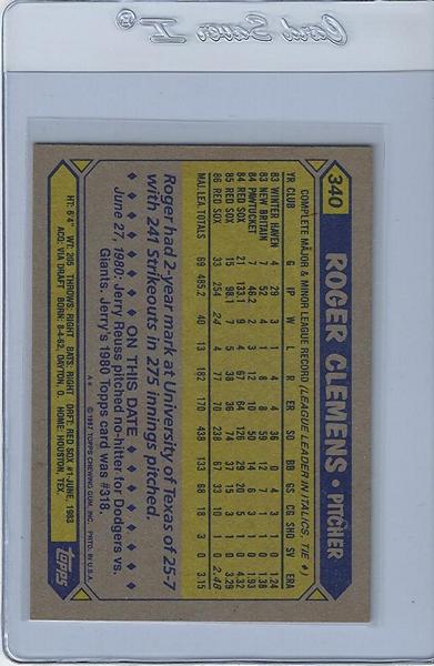Baseball Cards (Player: Roger Clemens)(Brand: Topps) (Type: N/A) (Subtype: N/A) (Kind of Packaging: Semi-Rigid) (Hall of Famer: Yes) (Superstar: No) (Rookie: No) (Unique Number: 340)(Year: 1987)