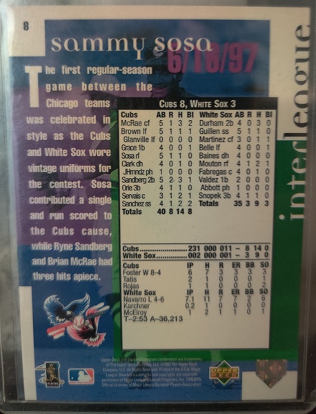 Baseball Cards (Player: Sammy Sosa) (Type: Special Report, History in the Making) (Feature: Interleague) (Unique Number: 8) (Numbered Card: N/A) (Brand: Upper Deck) (Year: 1997)
