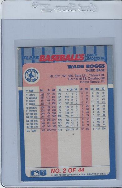 Baseball Cards (Player: Wade Boggs)(Brand: Fleer) (Type: League Leaders) (Subtype: N/A) (Kind of Packaging: Semi-Rigid) (Hall of Famer: Yes) (Superstar: No) (Rookie: No) (Unique Number: 2 of 44)(Year: 1988)