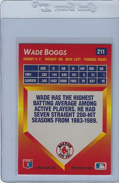 Baseball Cards (Player: Wade Boggs)(Brand: Leaf) (Type: Donrus) (Subtype: Triple Play) (Kind of Packaging: Semi-Rigid) (Hall of Famer: Yes) (Superstar: No) (Rookie: No) (Unique Number: 211)(Year: 1992)