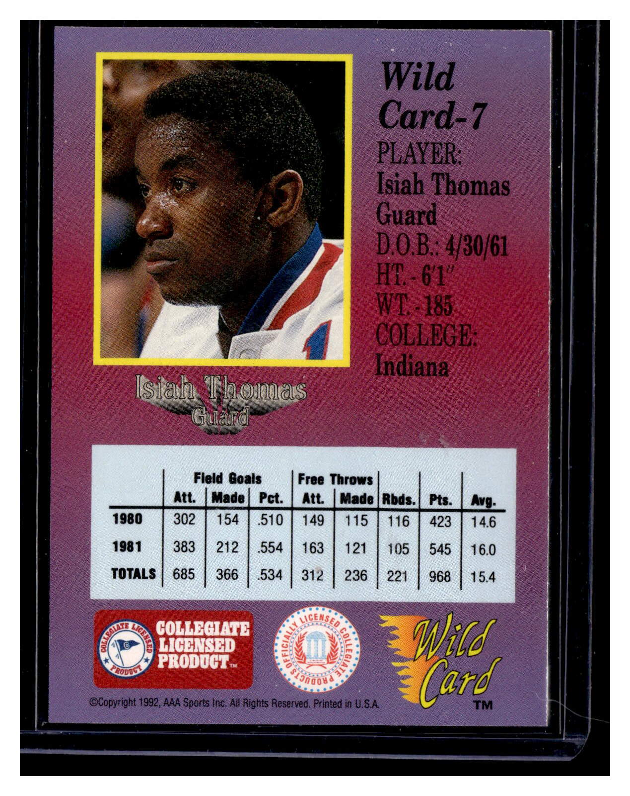 Basketball (Brand: AAA Sports) (Type: 1st Edition Wild Card Collegiate Premier Edition) (Subtype: Wild Card) (Hall of Famer: ) (Superstar: ) (Rookie: ) (Kind of Packaging: Toploader with Sleeve) (Year: 1992) (Unique Number: 7) (Numbered Card: ) (Player: Isiah Thomas)