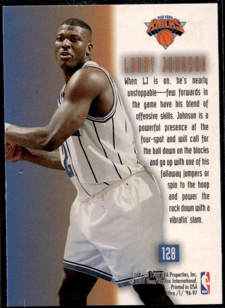 Basketball (Brand: Fleer/Skybox) (Type: ’96-97 Fleer Ultra) (Subtype: On the Block) (Kind of Packaging: Semi-Rigid with Sleeve) (Year: 1996) (Unique Number: 128) (Numbered Card: ) (Player: Larry Johnson))