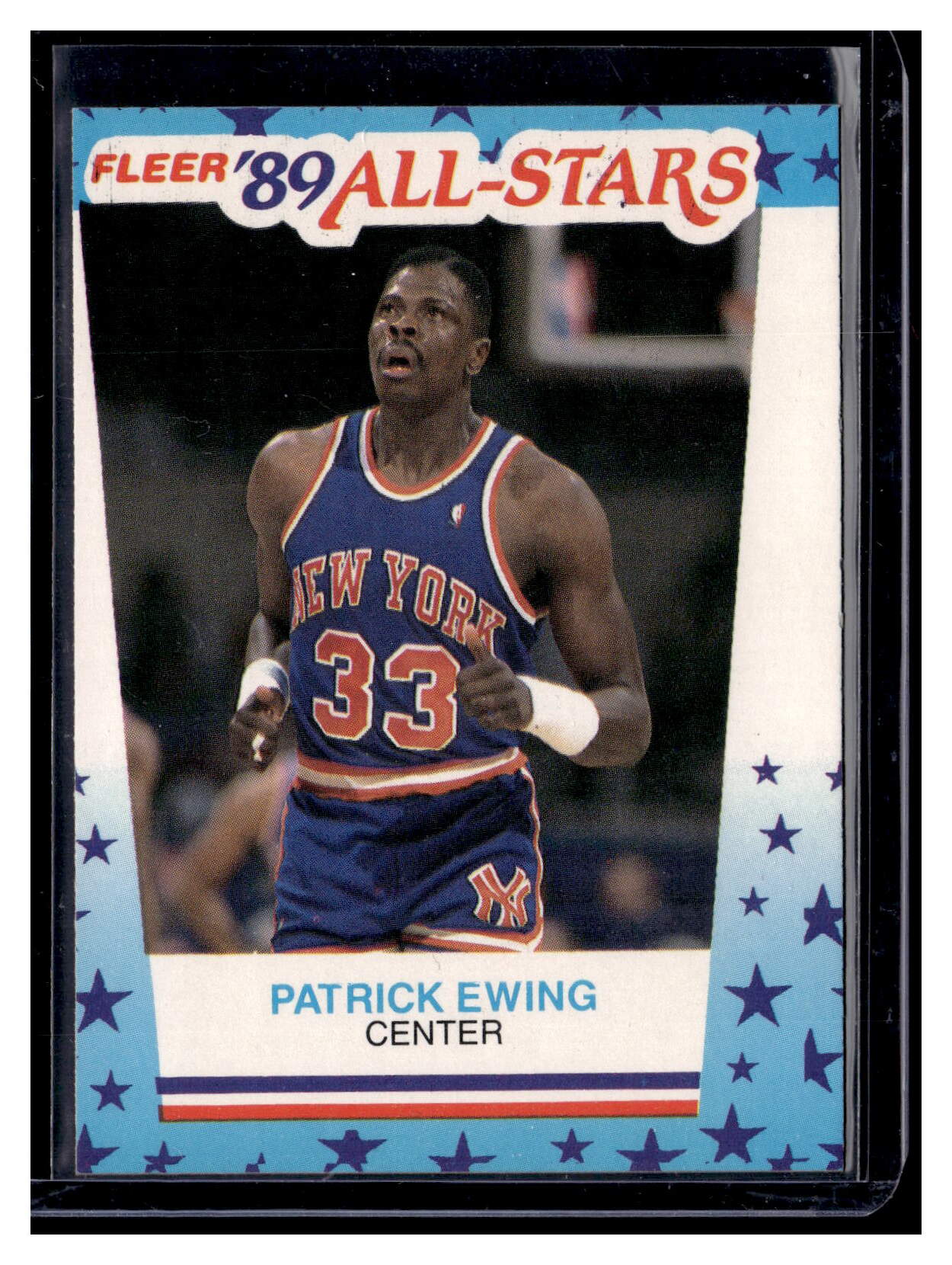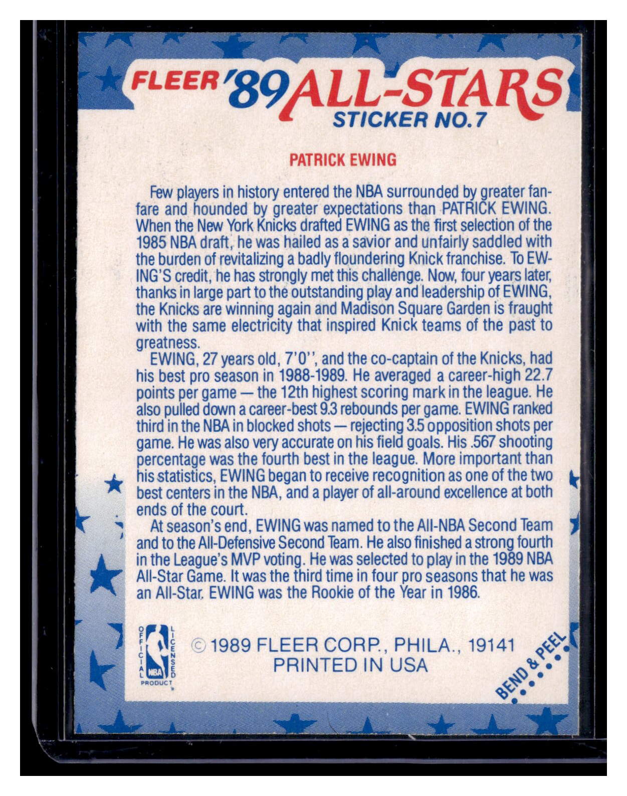 Basketball (Brand: Fleer) (Type: Fleer ’89 All-Stars) (Subtype: bend & peel) (Hall of Famer: ) (Superstar: ) (Rookie: ) (Kind of Packaging: Toploader with Sleeve) (Year: 1989) (Unique Number: Sticker 7) (Numbered Card: ) (Player: Patrick Ewing)