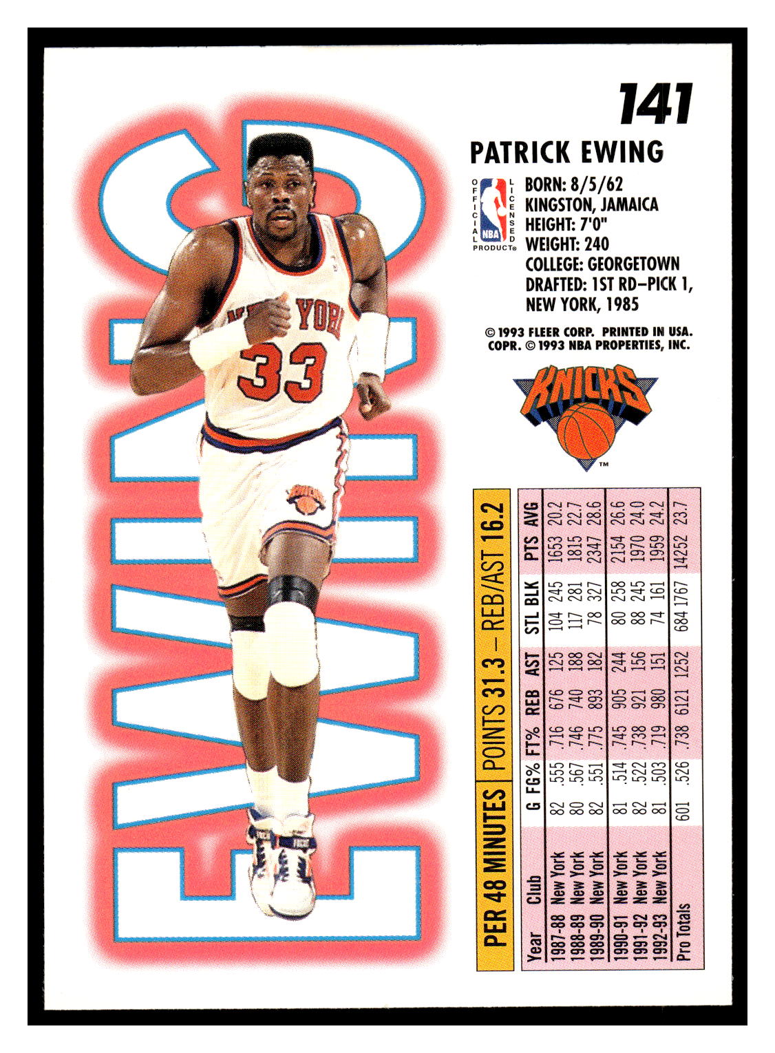 Basketball (Brand: Fleer) (Type: Fleer ’93-94) (Subtype: ) (Hall of Famer: ) (Superstar: ) (Rookie: ) (Kind of Packaging: Semi-Rigid with Sleeve) (Year: 1993) (Unique Number: 141) (Numbered Card: ) (Player: Patrick Ewing)