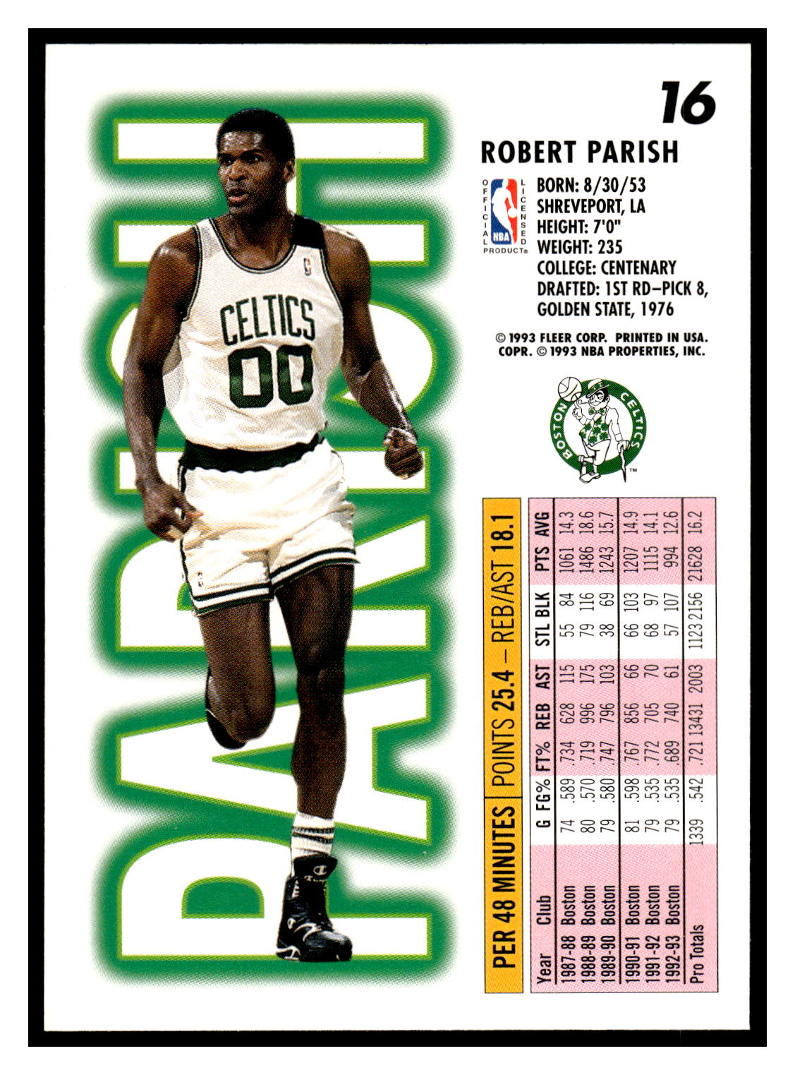 Basketball (Brand: Fleer) (Type: Fleer ’93-94) (Subtype: ) (Hall of Famer: ) (Superstar: ) (Rookie: ) (Kind of Packaging: Semi-Rigid with Sleeve) (Year: 1993) (Unique Number: 16) (Numbered Card: ) (Player: Robert Parish)