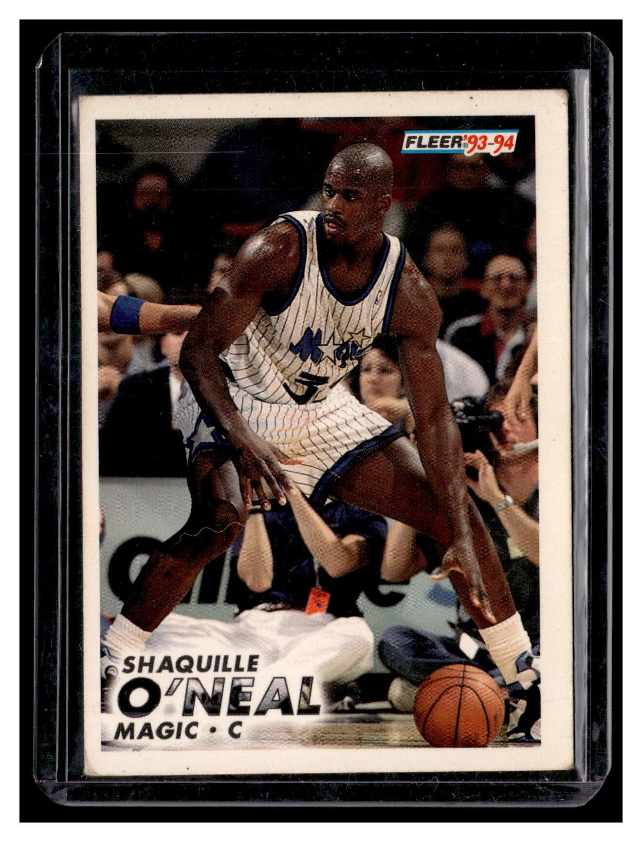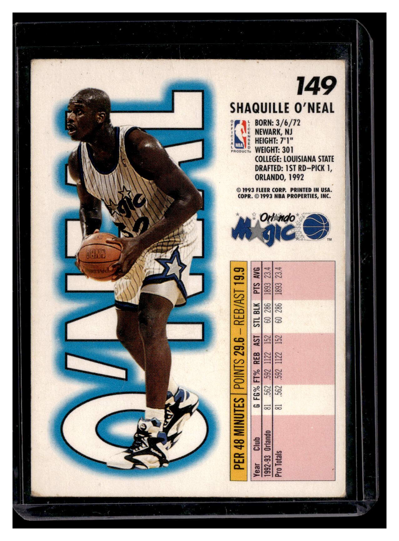 Basketball (Brand: Fleer) (Type: Fleer ’93-94) (Subtype: ) (Hall of Famer: ) (Superstar: ) (Rookie: ) (Kind of Packaging: Toploader with Sleeve) (Year: 1993) (Unique Number: 149) (Numbered Card: ) (Player: Shaquille O’Neal)
