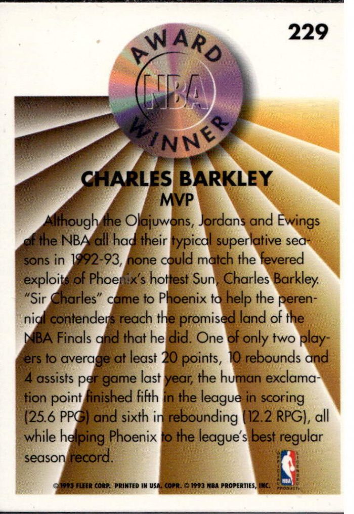 Basketball (Brand: Fleer) (Type: Fleer ’93-94) (Subtype: NBA Award Winner) (Kind of Packaging: Semi-Rigid with Sleeve) (Year: 1993) (Unique Number: 229) (Numbered Card: ) (Player: Charles Barkley))