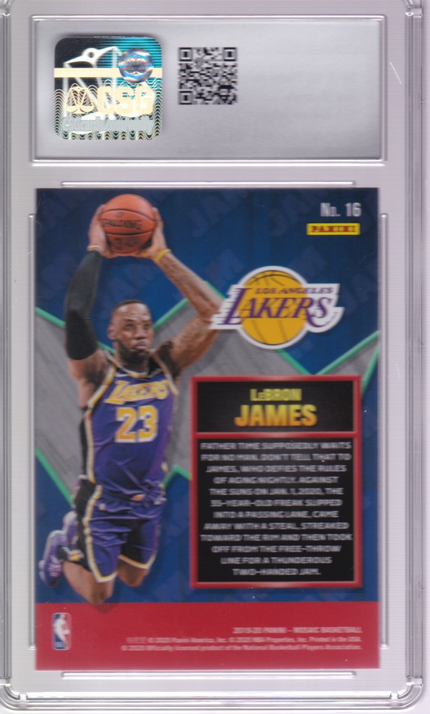 Basketball (Brand: Panini) (Type: 2019-20 Mosaic) (Subtype: Jam Masters) (Kind of Packaging: Graded Slabbed) (Year: 2020) (Unique Number: 16) (Grade: Mint 9) (Feature: LeBron James)