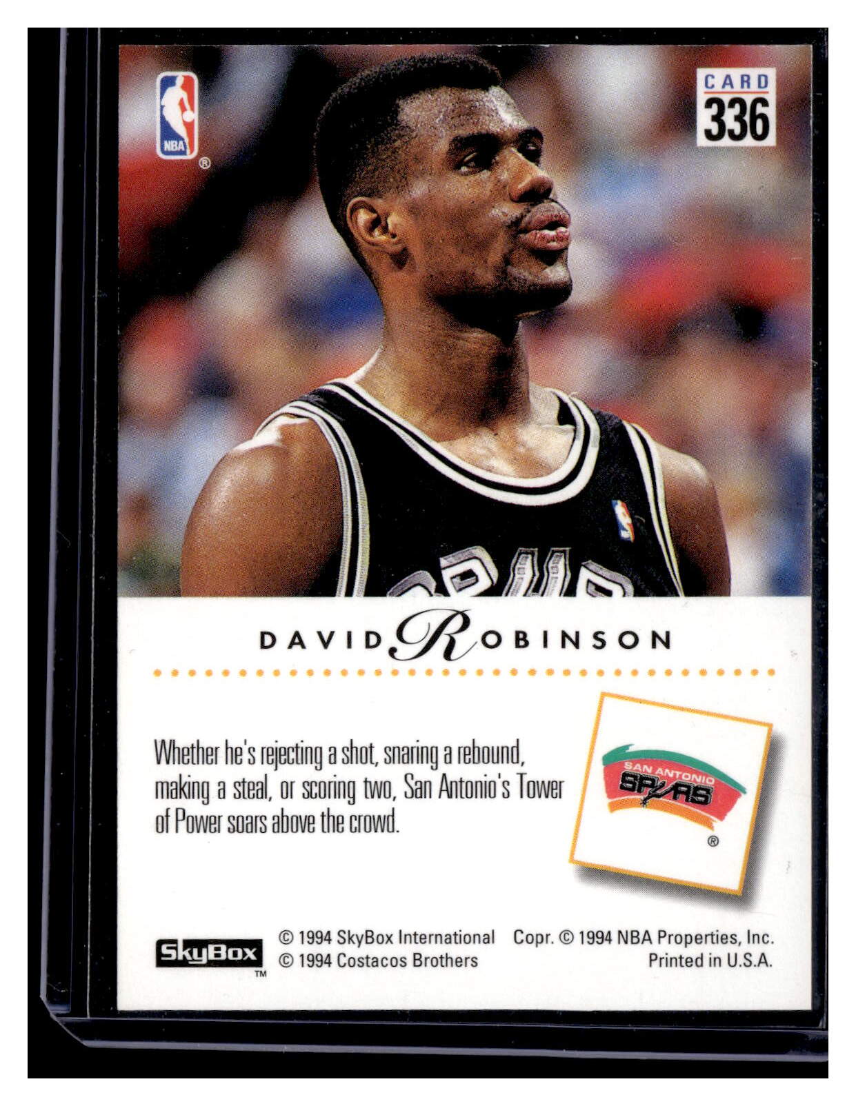 Basketball (Brand: Skybox) (Type: Tower of Power) (Subtype: ) (Hall of Famer: ) (Superstar: ) (Rookie: ) (Kind of Packaging: Toploader with Sleeve) (Year: 1994) (Unique Number: 336) (Numbered Card: ) (Player: David Robinson)