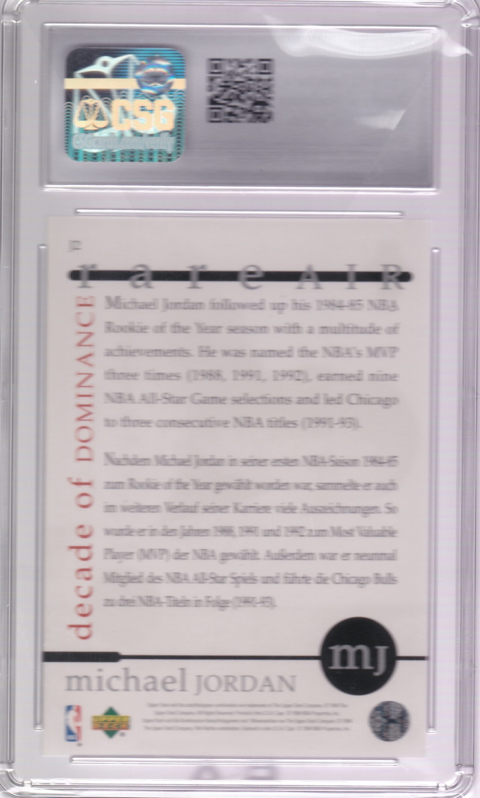 Basketball (Brand: Upper Deck) (Type: 1994-95 Collector’s Choice Intl.) (Subtype: Decade of Dominance, German) (Kind of Packaging: Graded Slabbed) (Year: 1994) (Unique Number: J2) (Grade: NM/Mint+ 8.5) (Feature: Michael Jordan)