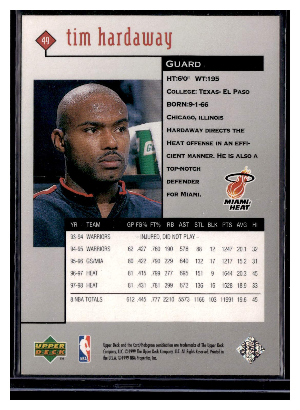 Basketball (Brand: Upper Deck) (Type: Black Diamond) (Subtype: ) (Hall of Famer: ) (Superstar: ) (Rookie: ) (Kind of Packaging: Toploader with Sleeve) (Year: 1999) (Unique Number: 49) (Numbered Card: ) (Player: Tim Hardaway)