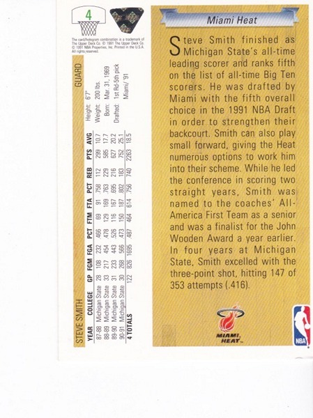 Basketball Card (Brand: Upper Deck) (Type: Upper Deck 91 92) (Subtype: NBA Draft) (Kind of Packaging: Semi-Rigid) (Sleeve: Yes) (Hall of Fame: No) (Superstar: Yes) (Rookie: No) (Year: 1991) (Unique Number: 4) (Numbered Card: ) (Player: Steve Smith)