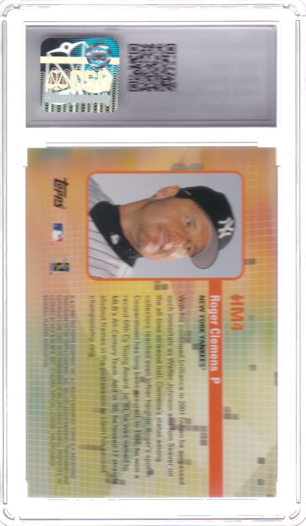 Baseball (Brand: Topps) (Type: 2002 Topps) (Subtype: Hobby Masters) (Kind of Packaging: Graded Slabbed) (Year: 2001) (Unique Number: HM4) (Grade: Gem Mint 10) (Feature: Roger Clemens)