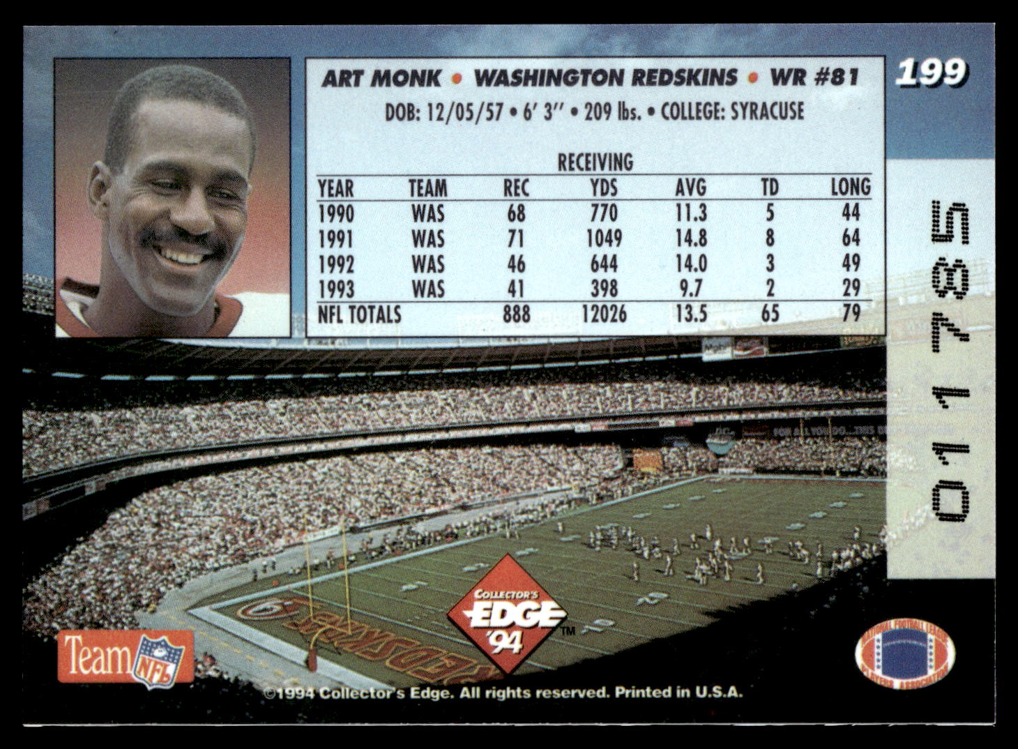 Football (Brand: Collector’s Edge) (Type: 1st Day) (Subtype: ) (Hall of Famer: ) (Superstar: ) (Rookie: ) (Kind of Packaging: Semi-Rigid with Sleeve) (Year: 1994) (Unique Number: 199) (Numbered Card: ) (Player: Art Monk)