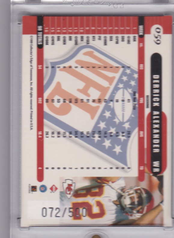Football (Brand: Collector’s Edge) (Type: Edge ’99 Supreme) (Subtype: Galvanized) (Hall of Famer: N) (Superstar: Y) (Rookie: N) (Kind of Packaging: Semi-Rigid with Sleeve) (Year: 1999) (Unique Number: O59) (Numbered Card: 072/500) (Player:Derrick Alexander)