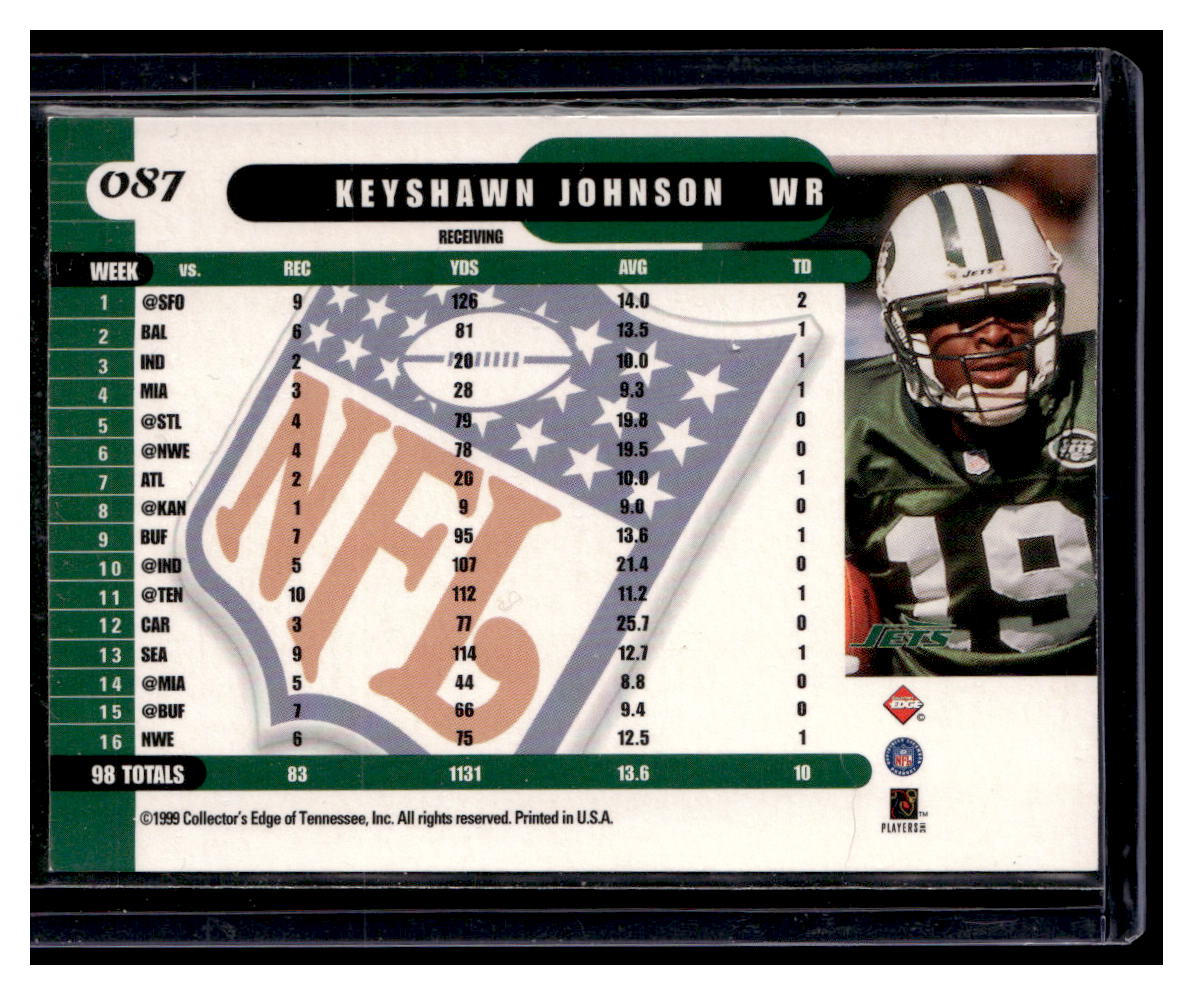 Football (Brand: Collector’s Edge) (Type: Edge ’99, Supreme) (Subtype: Gold Ingot) (Hall of Famer: ) (Superstar: ) (Rookie: ) (Kind of Packaging: Toploader with Sleeve) (Year: 1999) (Unique Number: O87) (Numbered Card: ) (Player:Keyshawn Johnson)
