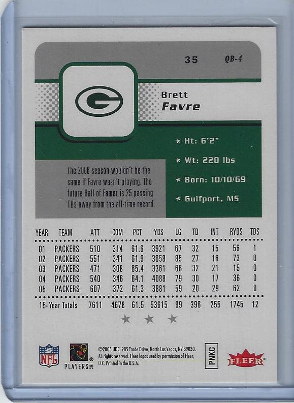 Football (Brand: Fleer) (Type: ) (Subtype: ) (Hall of Famer: Y) (Superstar: N) (Rookie: N) (Kind of Packaging: Top Loader with Sleeve) (Year: 2006) (Unique Number: 35) (Numbered Card: ) (Player:Brett Favre)