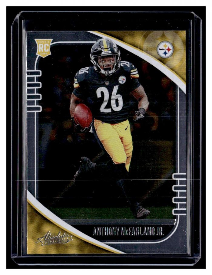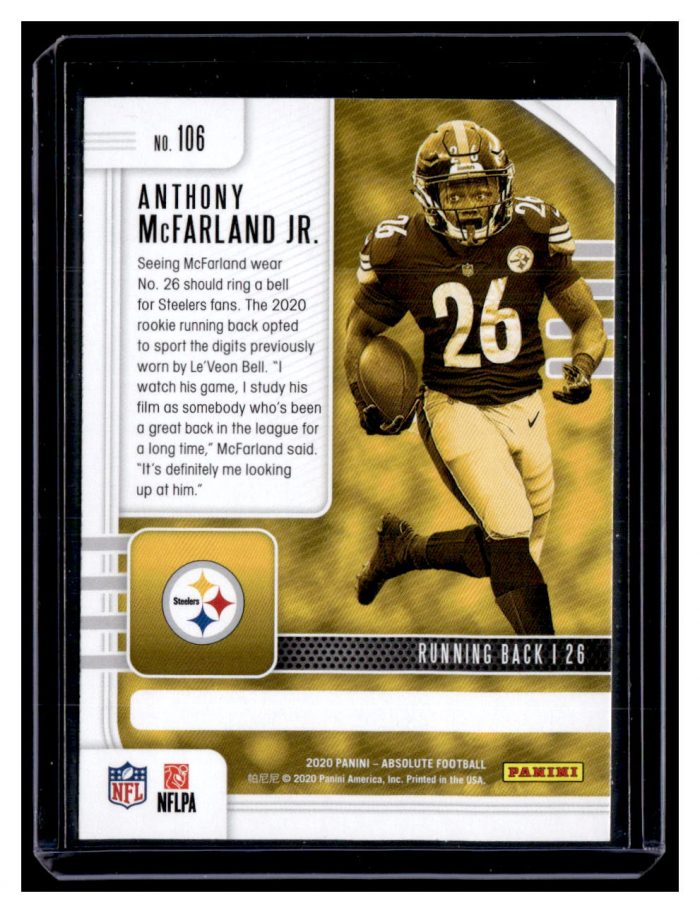 Football (Brand: Panini) (Type: 2020 Absolute) (Subtype: RC Rookie Card) (Hall of Famer: ) (Superstar: ) (Rookie: Y) (Kind of Packaging: Toploader with Sleeve) (Year: 2020) (Unique Number: 106) (Numbered Card: ) (Player:Anthony McFarland Jr.)