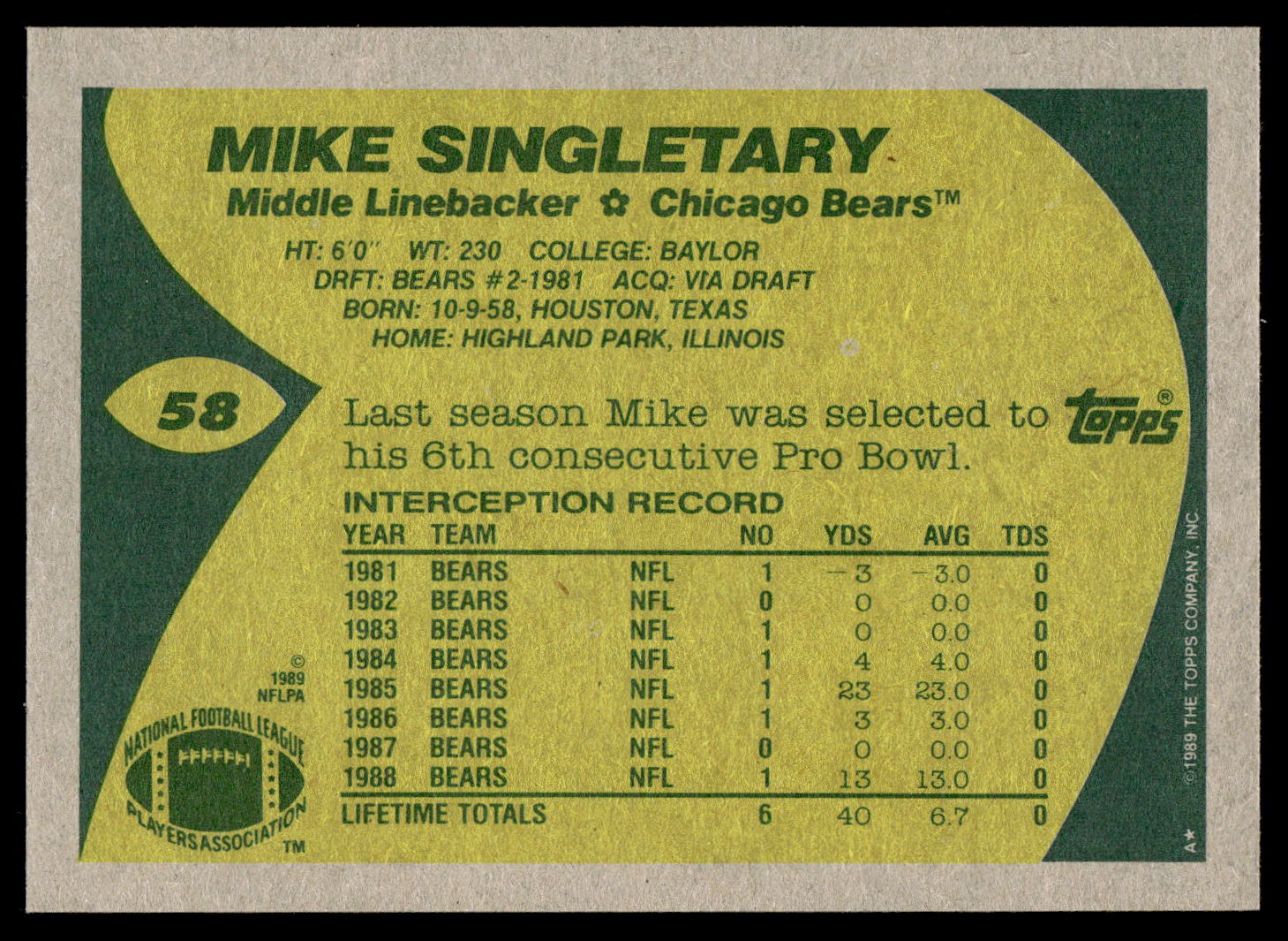 Football (Brand: Pro Set) (Type: All Pro) (Subtype: ) (Hall of Famer: ) (Superstar: ) (Rookie: ) (Kind of Packaging: Semi-Rigid with Sleeve) (Year: 1989) (Unique Number: 58) (Numbered Card: ) (Player: Mike Singletary)