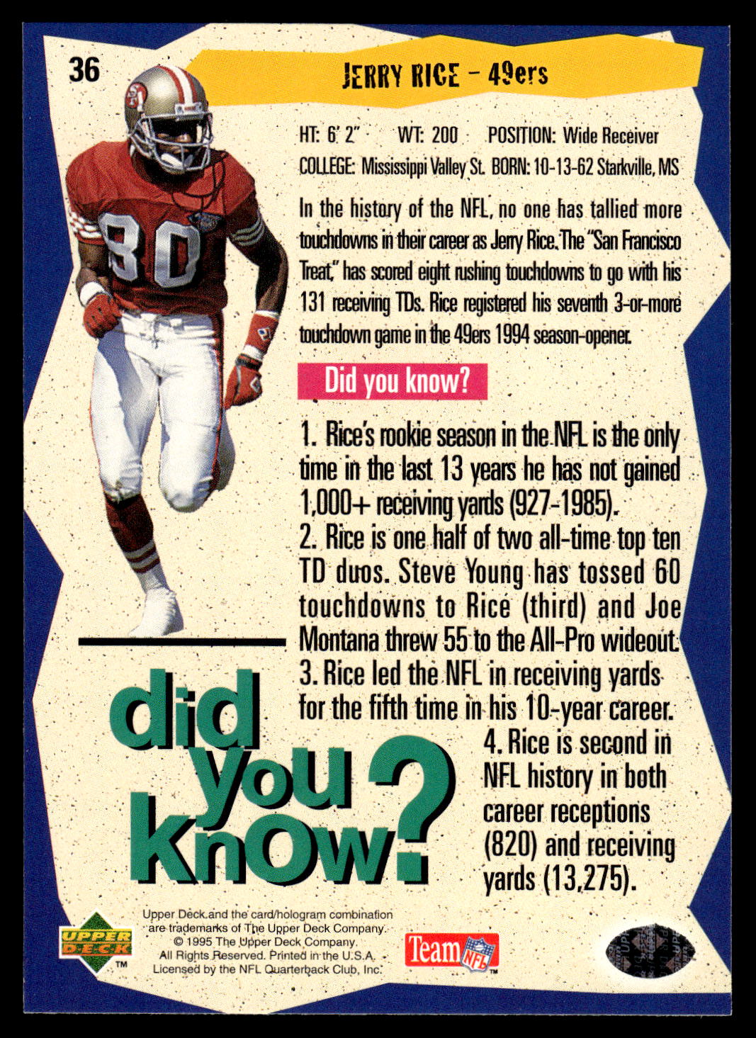 Football (Brand: Pro Set) (Type: Collector’s Choice) (Subtype: Did you Know?) (Hall of Famer: ) (Superstar: ) (Rookie: ) (Kind of Packaging: Semi-Rigid with Sleeve) (Year: 1995) (Unique Number: 36) (Numbered Card: ) (Player: Jerry Rice)