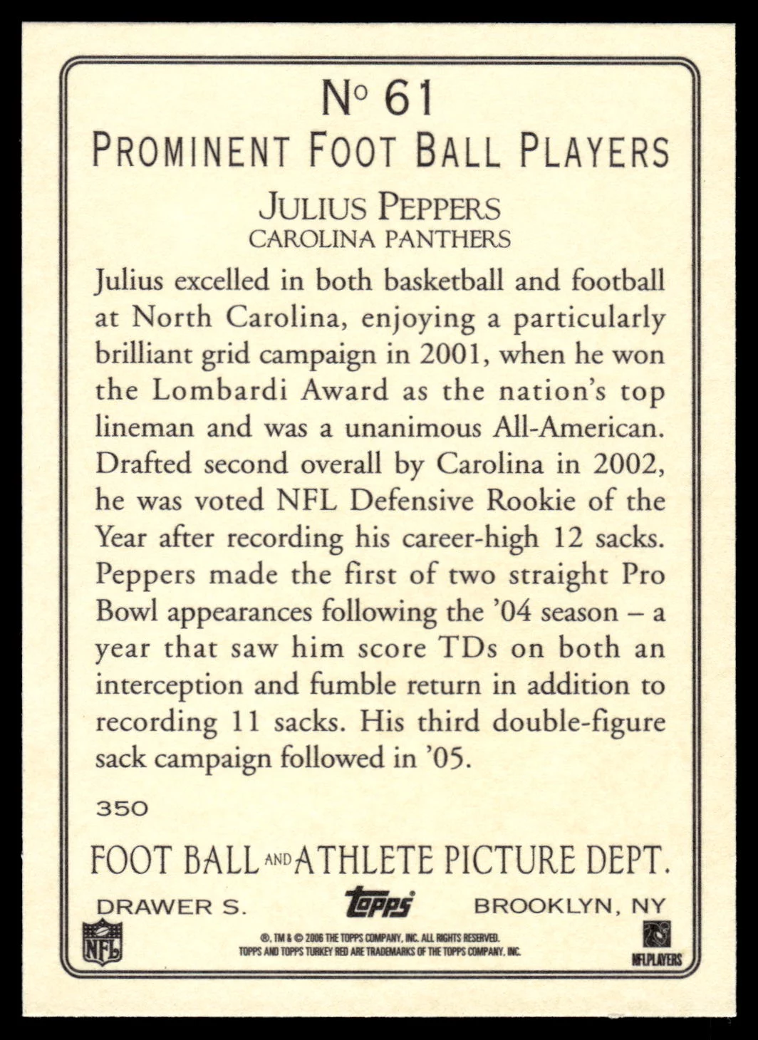 Brand: Topps Type: Turkey Red Subtype: Hall of Famer: Superstar: Rookie: Kind of Packaging: Semi-Rigid with Sleeve Year: 2006 Unique Number: 61 Numbered Card: Player: Julius Peppers