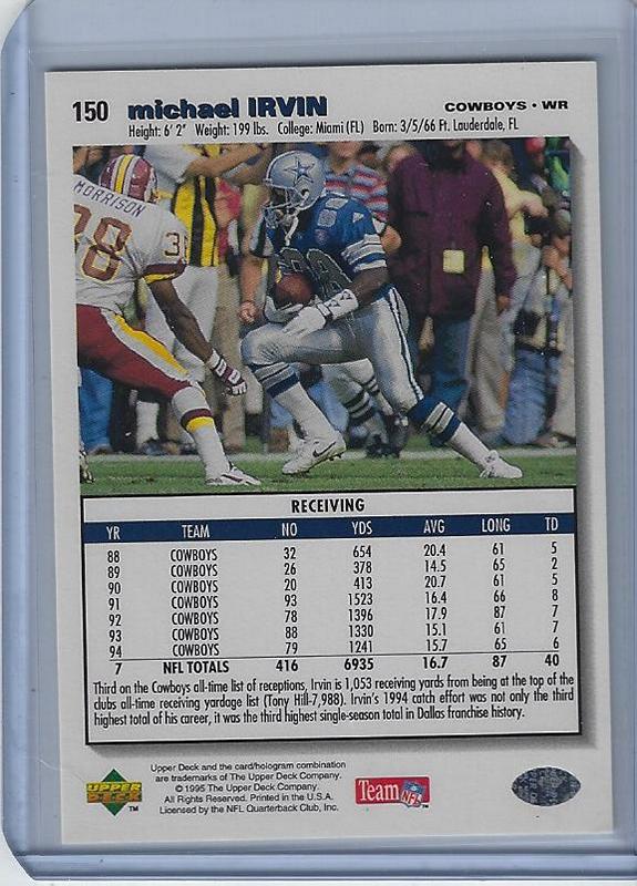 Football (Brand: Upper Deck) (Type: Collector’s Choice) (Subtype: ) (Hall of Famer: Y) (Superstar: N) (Rookie: N) (Kind of Packaging: Top Loader with Sleeve) (Year: 1995) (Unique Number: 150) (Numbered Card: ) (Player:Michael Irvin)