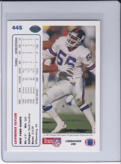 Football (Brand: Upper Deck) (Type: Upper Deck 1991) (Subtype: ) (Hall of Famer: ) (Superstar: ) (Rookie: ) (Kind of Packaging: Semi-Rigid with Sleeve) (Year: 1991) (Unique Number: 445) (Numbered Card: ) (Player: Lawrence Taylor)