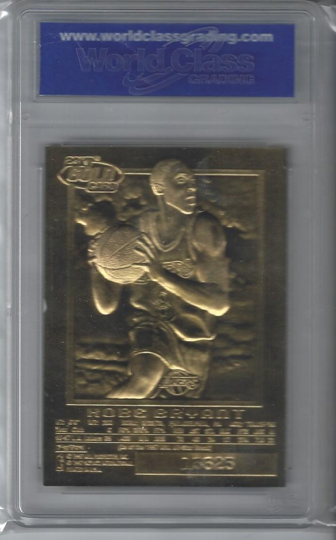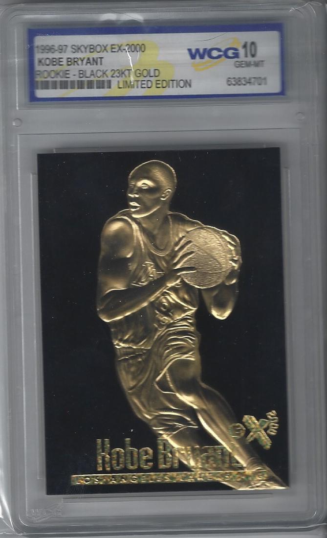 Graded Basketball Cards (Brand: Skybox) (Type: Skybox EX-2000 Rookie Black 23kt Gold Limited Edition) (Subtype: NA) (Kind of Packaging: Graded) (Grading Company: WCG) (Grade: GEM-MT 10) (HALL OF FAME: NA)(SUPERSTAR: NA) (ROOKIE: NA) (Year: 1996-97) (Unique Number: Serial Number 13525) (Numbered Card: NA) (Player: Kobe Bryant)