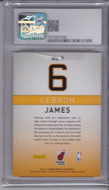 Graded Basketball Cards (Type: 2013-14 Pinnacle) (Subtype: Behind the Numbers, Artist Proof) (Copyright Year: 2014) (Grading Co.: CSG) (Grade: 9 Mint) (Unique Number: 7)(Numbered Card: )(Player: LeBron James)