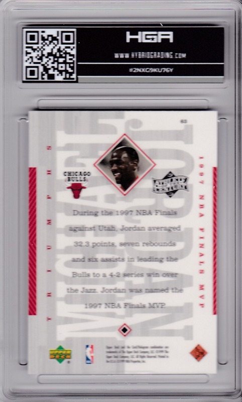 Graded Basketball Cards (Type: Athlete of the Century) (Subtype: Triumphs, 1997 NBA Finals MVP) (Copyright Year: 1999) (Grading Co.: HGA) (Grade: 9.0 Mint) (Unique Number: 63)(Numbered Card: )(Player: Michael Jordan)