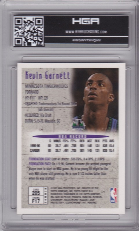 Graded Basketball Cards (Type: Finest Foundations) (Subtype: Theme F17 Common) (Copyright Year: 1997) (Grading Co.: HGA) (Grade: 9.0 Mint) (Unique Number: 205)(Numbered Card: )(Player: Kevin Garnett)
