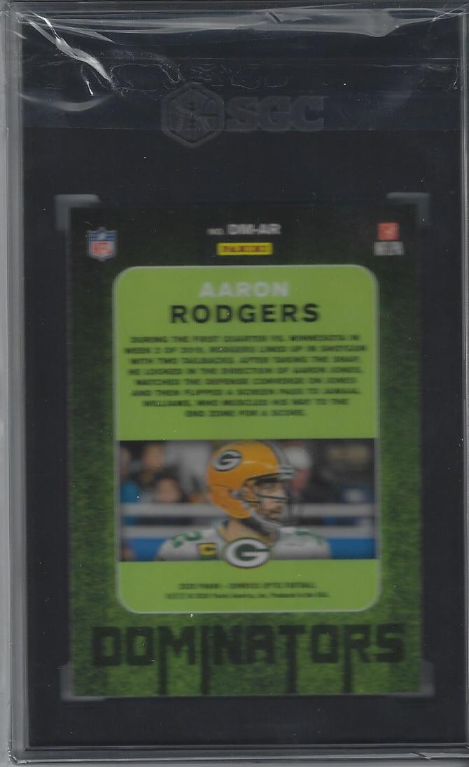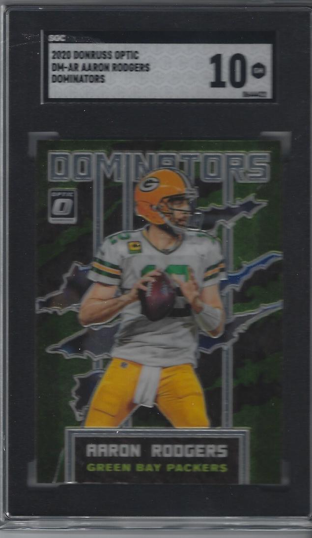 Graded Football Cards (Brand: Donruss) (Type: Optic) (Subtype: Dominators) (Kind of Packaging: NA) (Grading Company: SGC) (Grade: 10 GM) (HALL OF FAME: No)(SUPERSTAR: No) (ROOKIE: No) (Year: 2020) (Unique Number: DM-AR) (Numbered Card: NA) (Player: Aaron Rodgers)