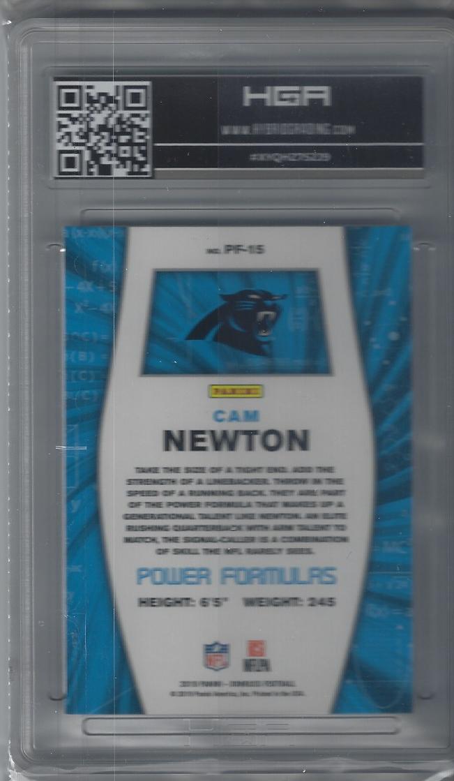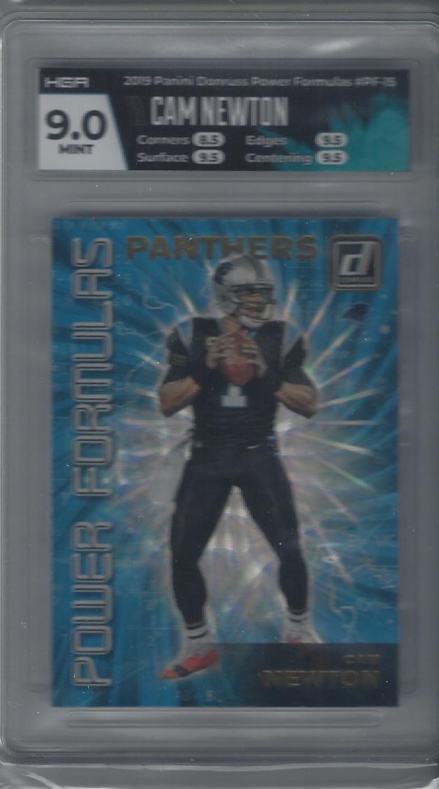 Graded Football Cards (Brand: Panini) (Type: Donruss) (Subtype: Power Formulas) (Kind of Packaging: Graded) (Grading Company: HGA) (Grade: 9.0 MINT) (HALL OF FAME: No)(SUPERSTAR: Yes) (ROOKIE: No) (Year: 2019) (Unique Number: PF-15) (Numbered Card: NA) (Player: Cam Newton)