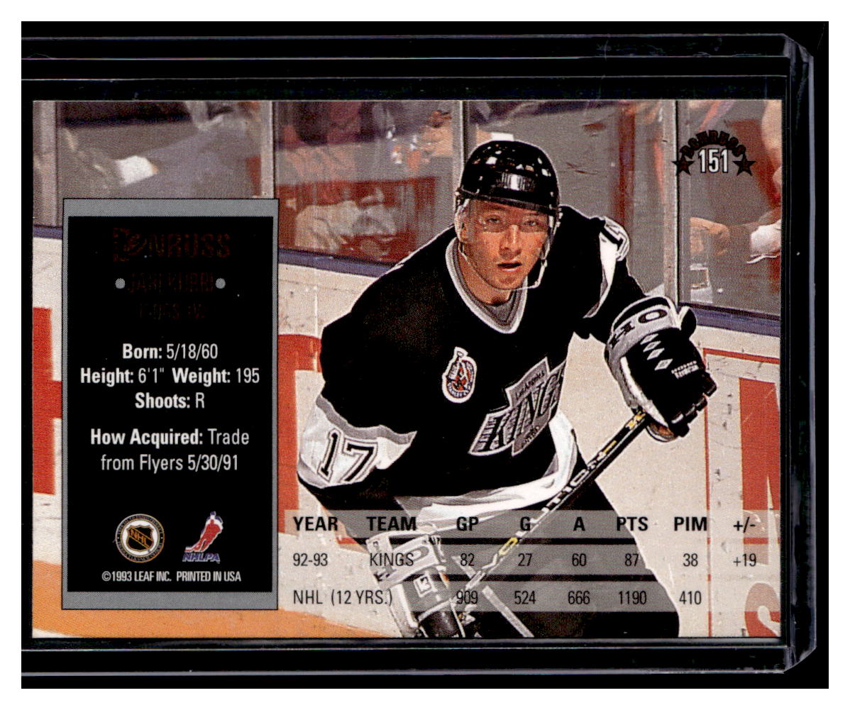 Hockey (Brand: Leaf) (Type: Donruss 1994) (Subtype: ) (Hall of Famer: ) (Superstar: ) (Rookie: ) (Kind of Packaging: Toploader with Sleeve) (Year: 1993) (Unique Number: 151) (Numbered Card: ) (Player: Jari Kurri)